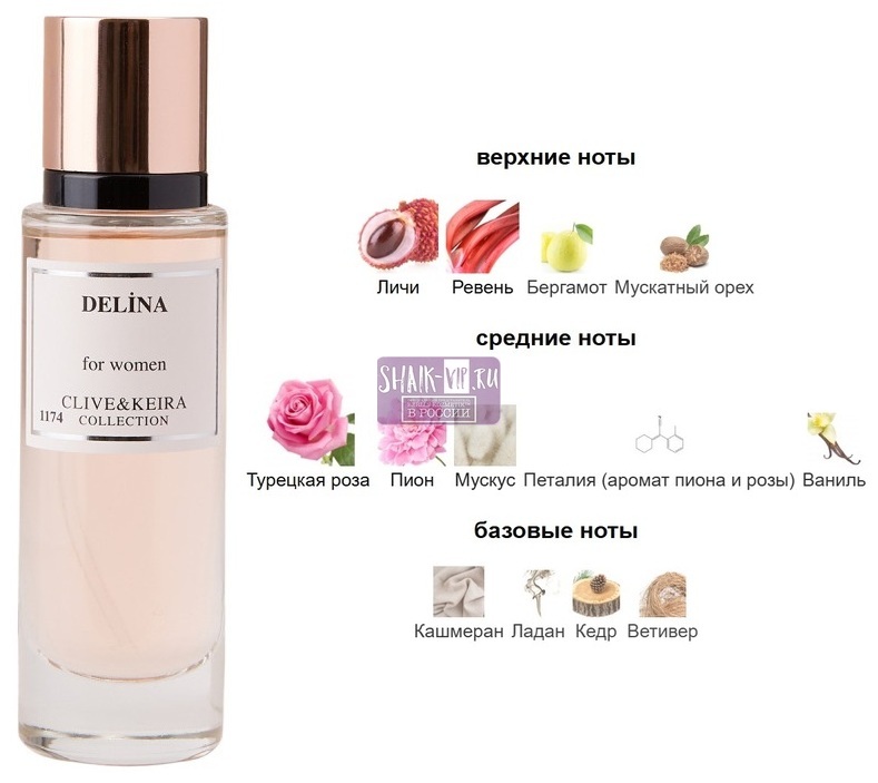 Delina Parfums de Marly — это аромат для женщин, он принадлежит к группе цветочные. Delina выпущен в 2017 году. Парфюмер: Quentin Bisch. Верхние ноты: Личи, Ревень, Бергамот и Мускатный орех; средние ноты: Турецкая роза, Пион, Мускус, Петалия (аромат пиона и розы) и Ваниль; базовые ноты: Кашмеран, Ладан, Кедр и Ветивер.