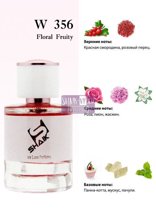 Shaik W356 - яркий аромат для сильной, темпераментной особы. Композиция начинает раскрываться с пикантных нот розового перца и кислой красной смородины. Цветочное сердце состоит из нот величественной розы, обворожительного жасмина и нежного пиона. Таинственный шлейф соткан из аккордов воздушной панна-котты, легкого мускуса, травянистого пачули.