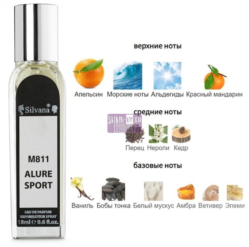 Silvana Alure Sport – оснащен удобным пульверизатором, способствующим более приятному знакомству с его ароматным содержимым. Он принадлежит к коллекции древесно-пряной парфюмерии, а также является идентичным популярному нишевому парфюму Chanel Allure Homme Sport.