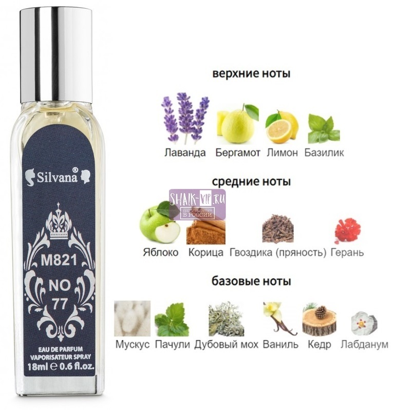 Silvana №77 – принадлежит к семейству восточно-фужерной парфюмерии. Он оснащен распылителем, гарантирующим максимально удобное знакомство с парфюмом, являющимся аналогом селективных духов Shаik Blue Palaces Of Designer No:77.