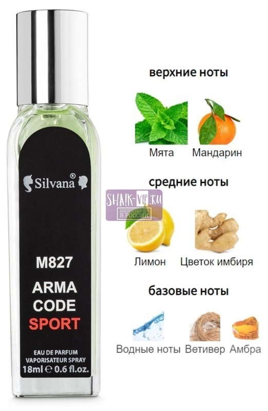 Silvana Arma Code Sport – принадлежит к группе древесно-ароматической парфюмерии. Он подобен по составу и звучанию на люксовый парфюм итальянского происхождения Giorgio Armani Code Sport.