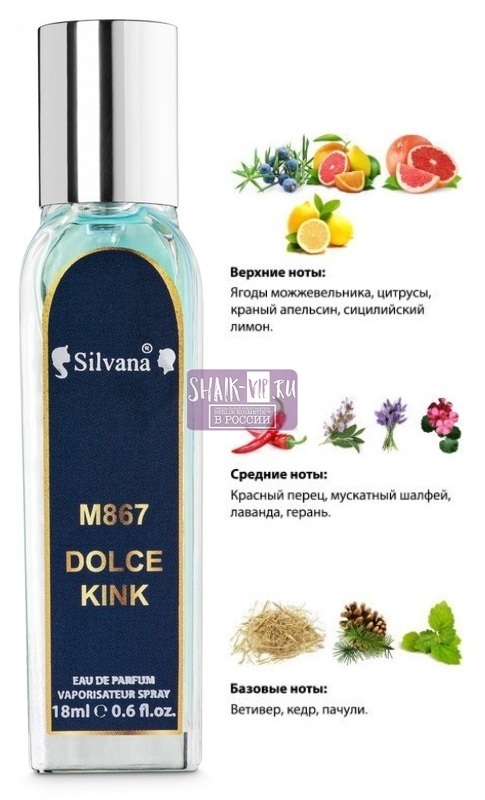 Silvana Dolce Kink – относится к группе древесно-ароматической парфюмерии. Он дополнен удобным для распыления пульверизатором, делающим максимально комфортным знакомство с ароматом-аналогом DG K.