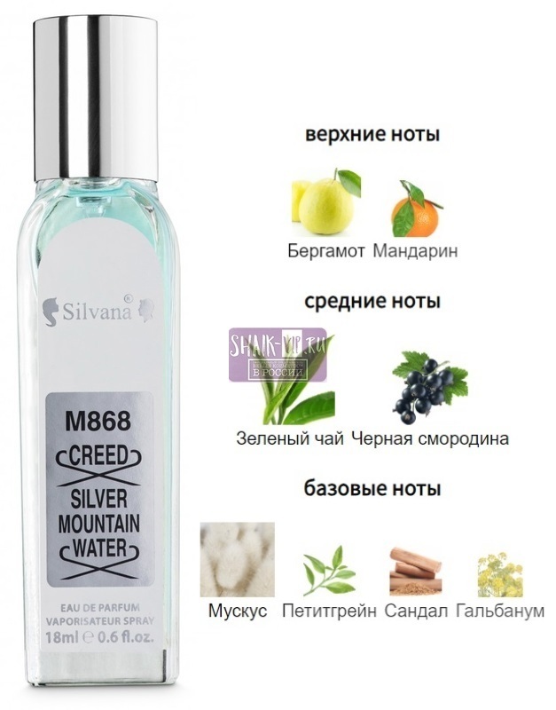 Превосходный мужской аромат - Silvana Silver Mountain – принадлежит к цитрусовой категории парфюмерии. Он презентует чувства ощутимого морозного воздуха, исходящего от снежных, горных вершин и является более доступным вариантом селективных духов Creed Silver Mountain Water («Серебряная Горная Вода»).