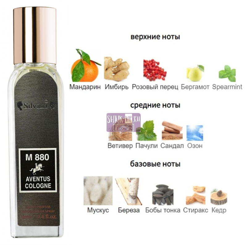 Сильный и стремительный роскошный шлейф Парфюма SILVANA AVENTUS COLOGNE 18 мл раскрывает новые грани аромата победителя. Парфюм 880-M SILVANA AVENTUS создан по древесно-фруктовой пирамиде аромата. Верхние ноты аромата парфюмерной воды: имбирь, мандарин, розовый перец. Ноты сердца аромата: ананас, ветивер, пачули. Базовые ноты парфюма: береза, мускус, стиракс.
