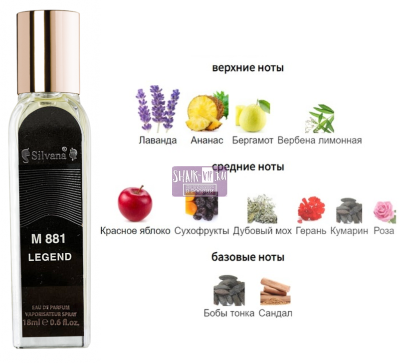 Элегантный и современный парфюм SILVANA M881 LEGEND является воплощением силы и чувственной мужественности. Группа ароматов: фужерные. Верхние ноты: бергамот, лаванда, цитрусы. Ноты сердца: белый кедр, жасмин, роза. Базовые ноты: бобы тонка, дубовый мох, сандал. Аромат – это часть жизни, возможность самовыразиться и привлечь внимание.