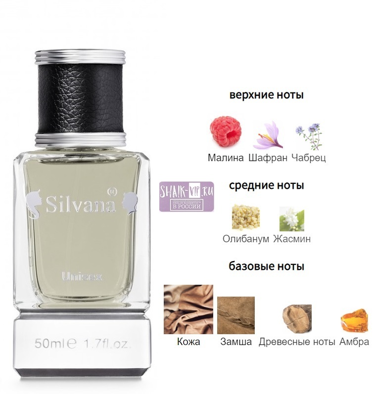 Парфюмерная вода146-U Silvana "TUSCAN LEAT" 50мл это необычный унисекс парфюм, который будет прекрасно сочетаться с любым стилем. Композиция этого парфюма содержит молекулы, которые возбуждают чувства и создают уникальный запах, который легко узнать на фоне других ароматов. Парфюмерная вода сочетают в себе аккорды шипра, теплую кожу и сладость малины, сочетая фруктовые нотки. Запах 146-U Silvana Парфюм "TUSCAN LEAT" 50мл будоражит возбуждающие ощущения, дарит тепло и комфорт, а его шлейф привлекает внимание окружающих. Дорогой и комплиментарный нишевый аромат для обоих полов. Шикарная композиция принадлежит к группе кожаные. Парфюмерная композиция аромата начинается с нот шафрана, тимьяна и сладкой малины. В сердце страстный жасмин и олибанум. Шлейф широкий, его долгое звучание обеспечивается базовыми нотами: кожа, замша, древесные ноты и амбра. Парфюм обаятелен зимой, осенью и весной, когда веет прохладой.