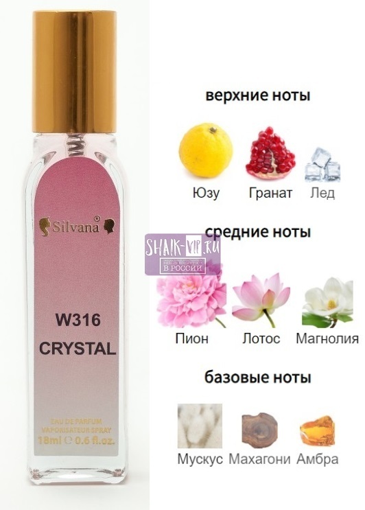 Аромат Silvana Crystal является идентичным селективным духам Versace Bright Crystal («Яркий Кристалл»). Он подарит своим обладательницам превосходную свежесть, акцентирует внимание на их преимуществах, придаст эксклюзивности любому образу.