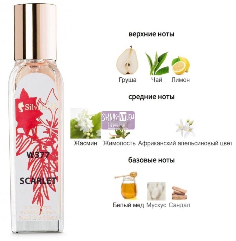 Яркий насыщенный аромат цветочно-мускусной композиции духов Scarlett от Silvana построена на букете цветов, в который входит жасмин, жимолость и цветы апельсина. Долгий шлейф послевкусия запоминается сладким и манящим созвучием липового меда, мускуса и сандалового дерева.