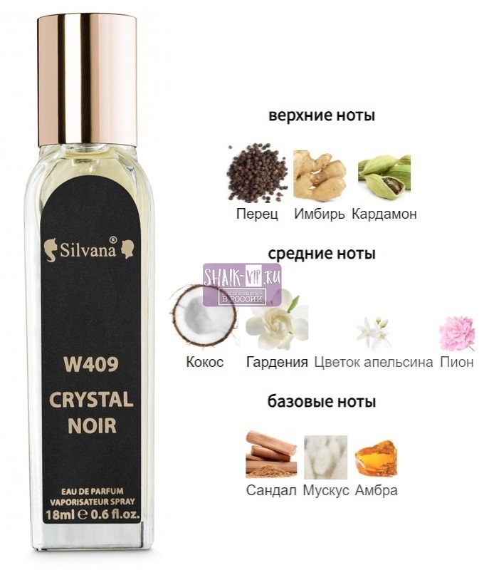 Silvana W409 Versace Crystal Noir Women цветочная композиция с отдельными восточными нотами, при более близком знакомстве раскрывается ароматом цветов гардении, который является любимым цветком Донателлы Версачи. Название аромата можно перевести как черный кристалл и это идеальным образом характеризует изысканный и утонченный характер этого парфюма, который создавался специально для шикарных женщин, любящих блистать и покорять мужские сердца. На женской коже аромат начинает раскрываться с первых же секунд использования, унося в мир чувственности и смелых фантазий, который обязательно будет реализованы, стоит лишь этого по-настоящему захотеть. Он дразнит и меняется, представляясь поначалу вполне понятно и постепенно переходя в непредсказуемый и соблазнительный коктейль, раскрыть который можно будет далеко не сразу. Каждая женщина, использую этот аромат, сможет подчеркнуть свою природную соблазнительность и чувственность, стать более притягательной и желанной, немного загадочной и бесконечно привлекательной. И не важно, будет ли это первое свидание или юбилей продолжительной семейной жизни - мужчина будет смотреть на нее так, как смотрят только на самых горячо желаемых женщин, получить благосклонность которой мечтают любой ценой, при этом ничего не прося взамен. Высокая мода и природная чувственность и сексуальность, изысканное очарование и безграничная притягательность, немного мистическая красота и таинственность образа - все это аромат Silvana W409 Versace Crystal Noir Women.