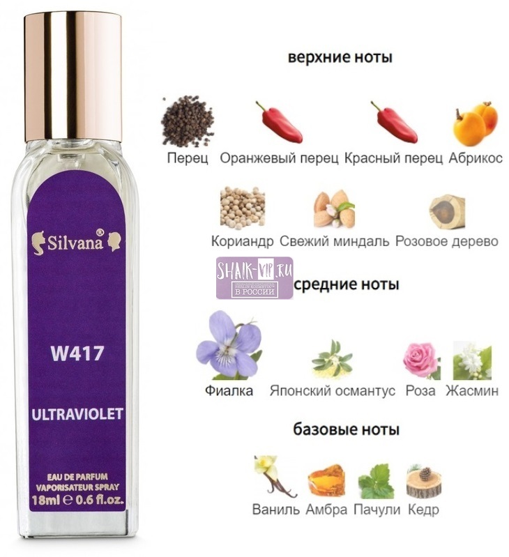 Легкий и ненавязчивый, приятный и деликатный, со своей особенной и неповторимой “изюминкой”- всё это прекрасная парфюмерная вода Silvana Ultraviolet Oriental - Floral. Потрясающий аромат фиалки, который раздается вокруг, чередование ноток пряностей, кориандра, абрикоса, цветов. Не досягаемый, универсальный аромат пройти мимо которого и не заметить просто невозможно. Нежнейший, с намеком сладости, который окутывает своим теплом и мягкой сексуальностью, он придает образу своей обладательницы немного восточной чувственности и соблазнительности.