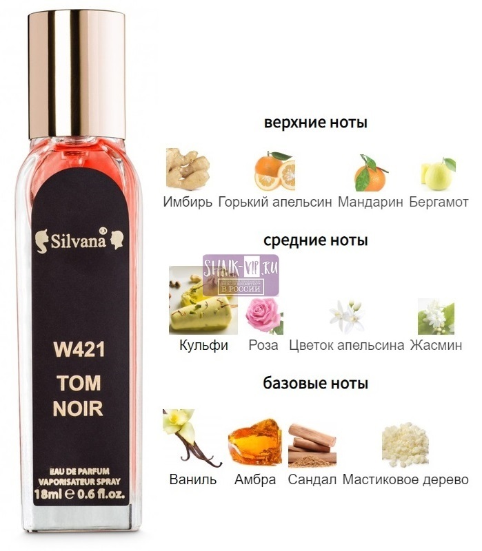 Парфюмерный мастер Silvana W421 Tom Ford Noir Women сочетал разнообразную палитру утонченных красок, которые способны пробудить женственную натуру и создать неотразимое впечатление о хозяйке. Сочные цитрусовые ноты, приветствующие окружающих в начале, обладают нежной игривой горчинкой, которая, как легкая, еле заметная изюминка, обвораживает и привлекает. Сладострастное звучание распускающихся цветов, которое последует за цитрусовой искринкой, обогатит помещение ароматами розы, жасмина и апельсинового цвета. А пудрово-древесная вуаль создаст роскошный шлейф, который не пропустит ни один человек, находящийся неподалеку. Аромат идеально подойдет для вечерних прогулок под яркой луной или для приема