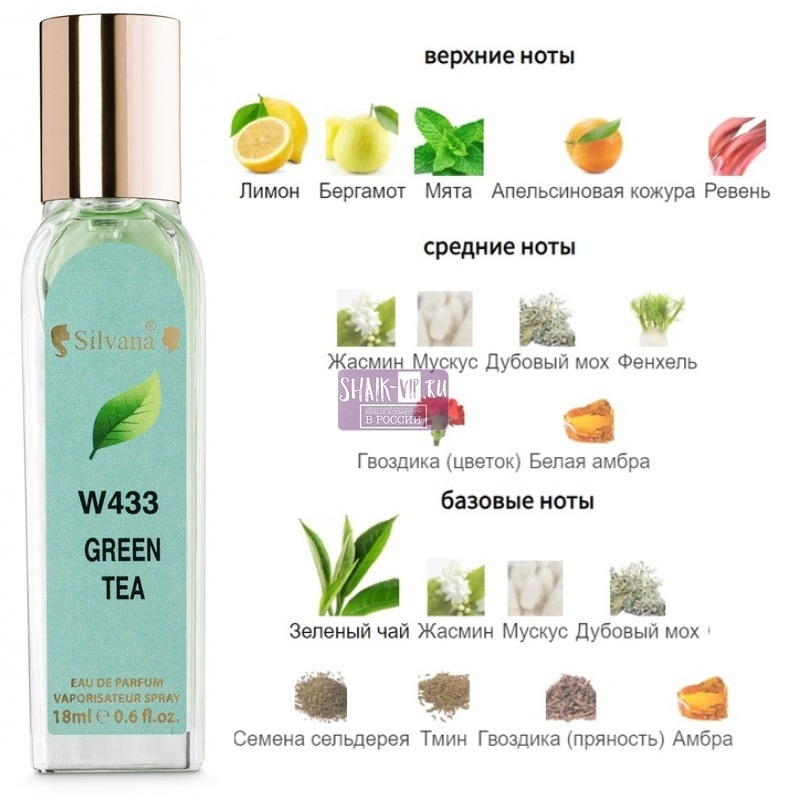 Женская парфюмерная вода SILVANA 433-W GREN TEA это невероятное ощущение легкой прохлады и свежести, созданное на основе исключительно натуральных и чистых природных компонентов. Этот кристальный аромат способен возродить жизненную энергию, вселить чувство оптимизма и веру в себя. Конечно же, самой яркой и запоминающейся нотой этого пленительного парфюма стал ароматный зеленый чай. Кроме того, в букете «Green Tea» чувствуются оттенки свежей мяты и цитрусов, фенхеля, мха и мускуса. Благодаря ним парфюм раскрывается и превращается в удивительный освежающий коктейль, ингредиенты которого органично подобраны и великолепно сочетаются между собой.