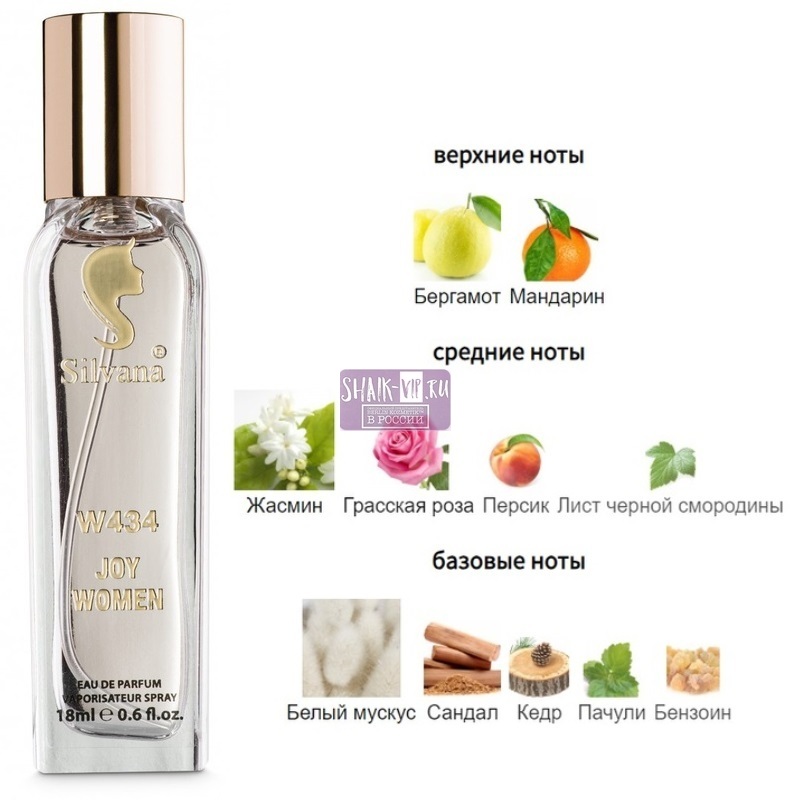 Роскошный женский аромат - Silvana Joy Women – принадлежит к цитрусово-цветочной ароматной коллекции. Он обладает ослепительным, захватывающим дух темпераментом и является идентичным дорогому нишевому парфюму Christian Dior Joy («Счастье»).